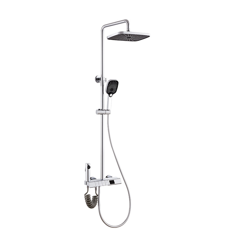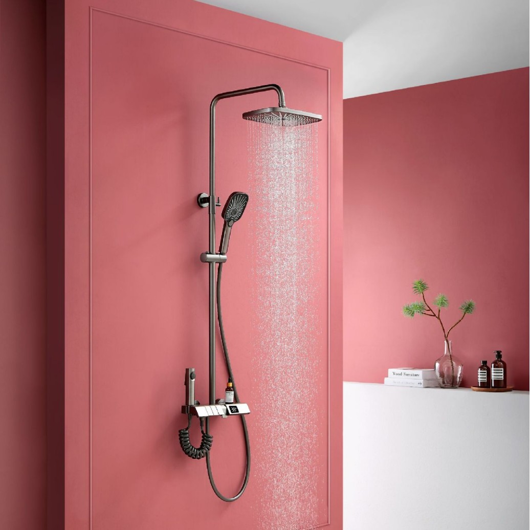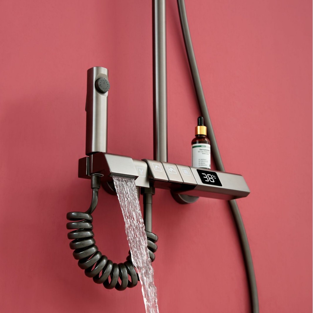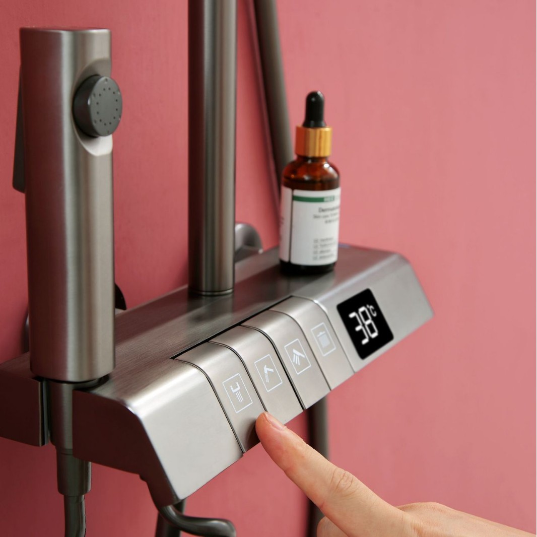 This luxury shower system features an ‘aircraft carrier’ inspired design with intuitive piano-key controls for different water outlets. Made of pure copper with a pressure-boosting rainfall head, it offers a sophisticated spa-like experience for home bathrooms.