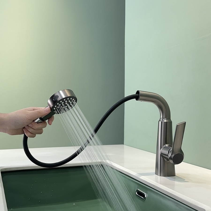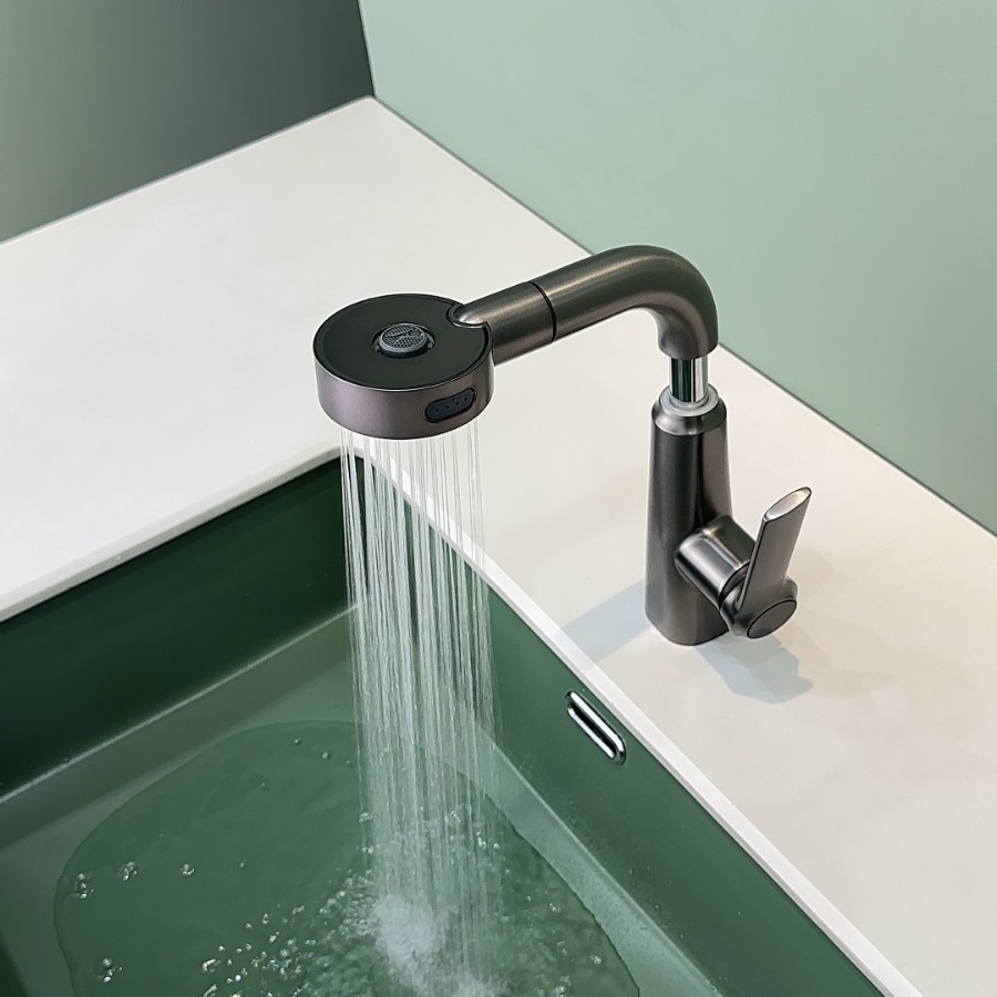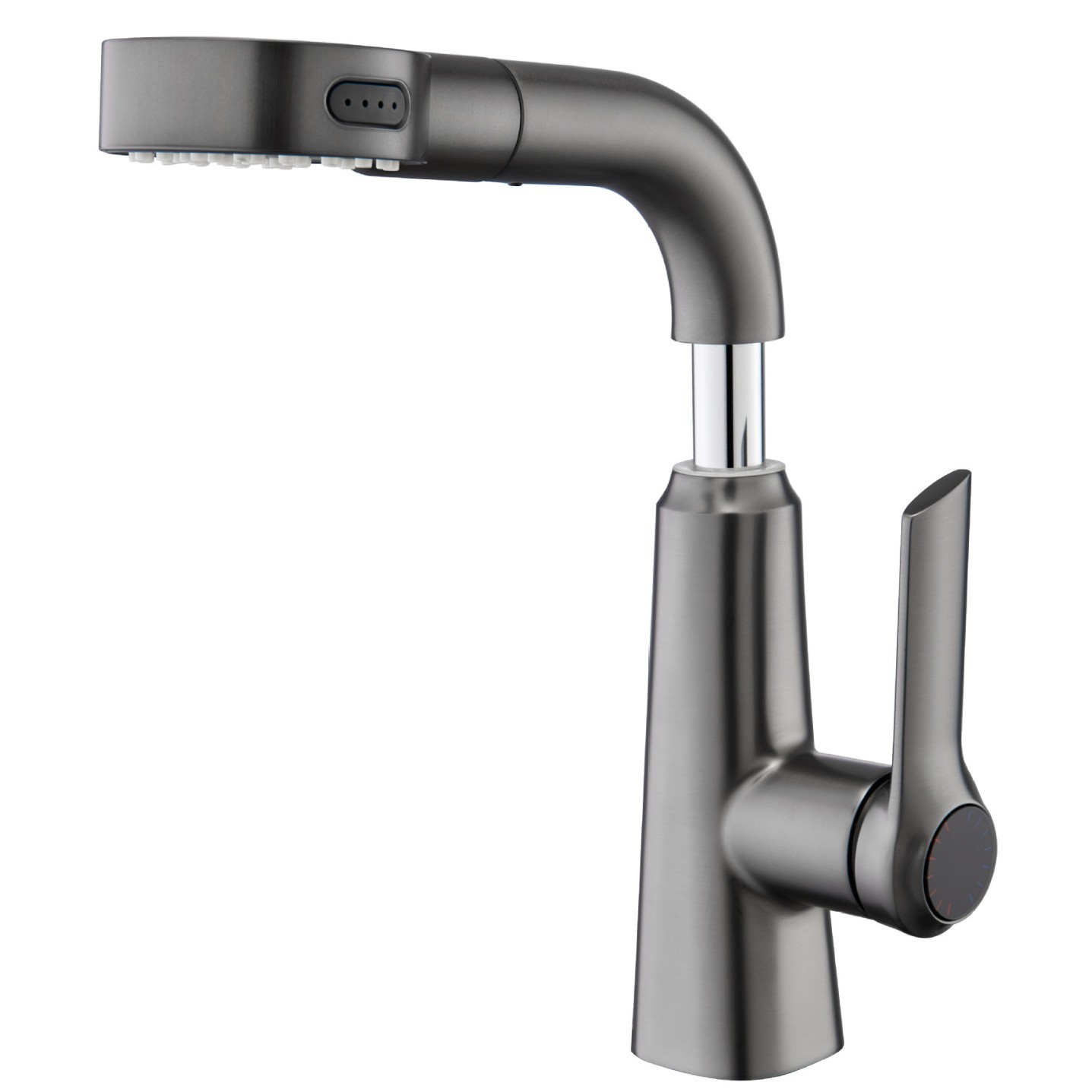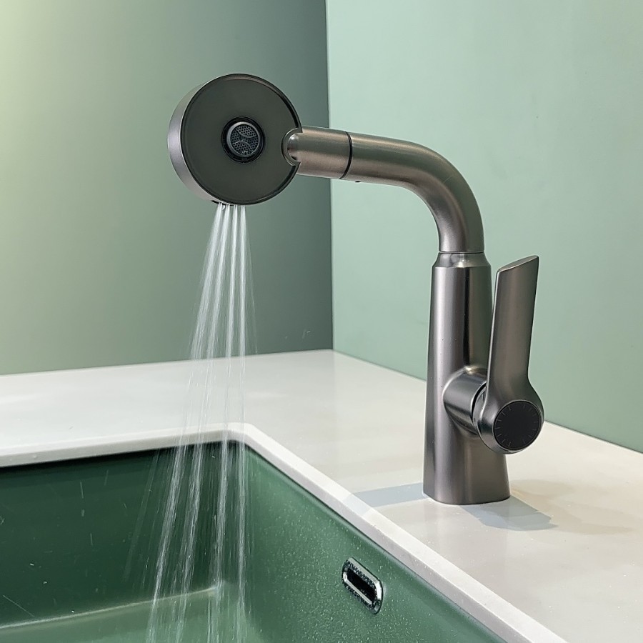 Specialized height-adjustable lift spout design; pull-out sprayer ideal for hair washing and sink cleaning; elegant cream white finish with gold accents; solid brass hot/cold mixer control.
