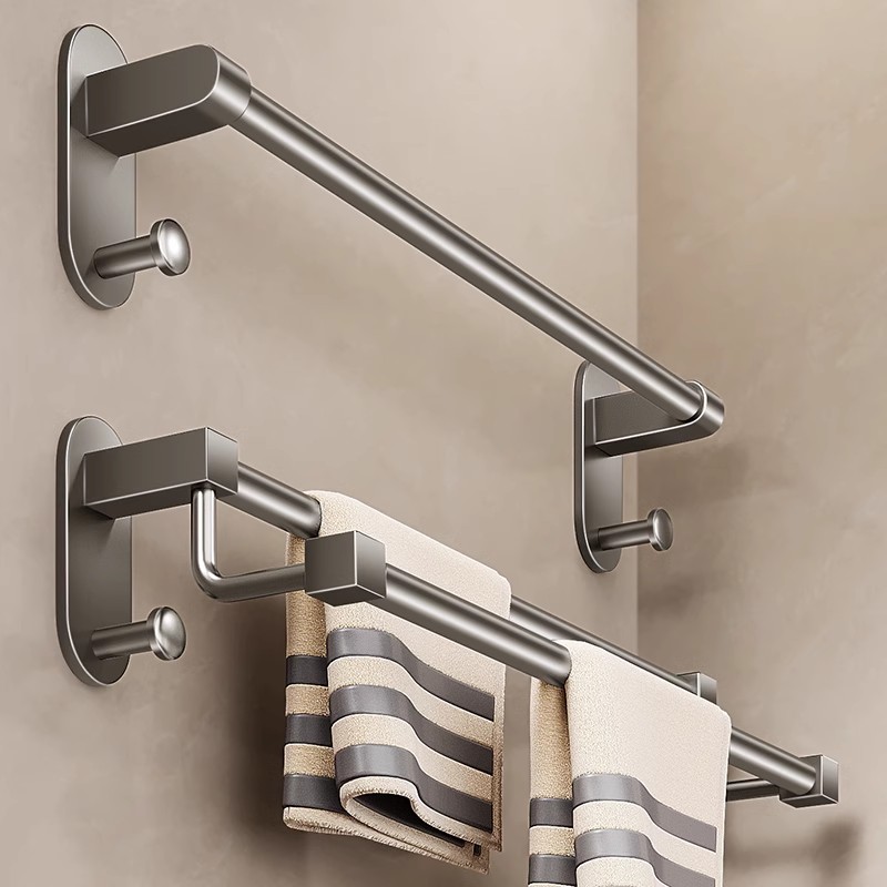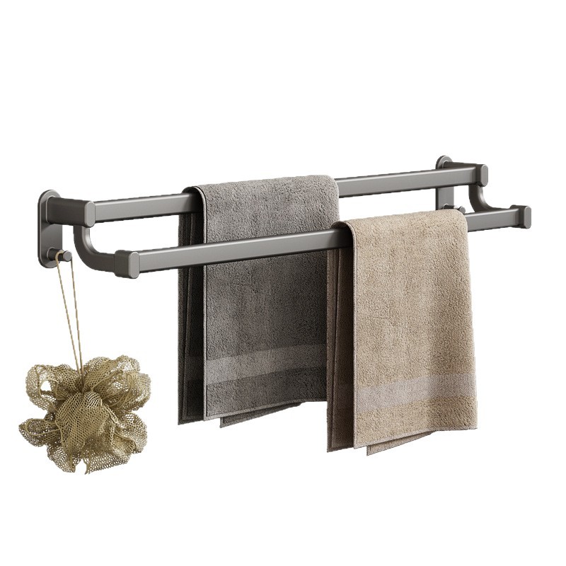 Modern gunmetal grey double-bar towel rack for sleek bathroom organization. Made from high-grade rust-proof space aluminum with a light-luxury finish. Features a professional punch-free, no-drill installation system for clean wall mounting.