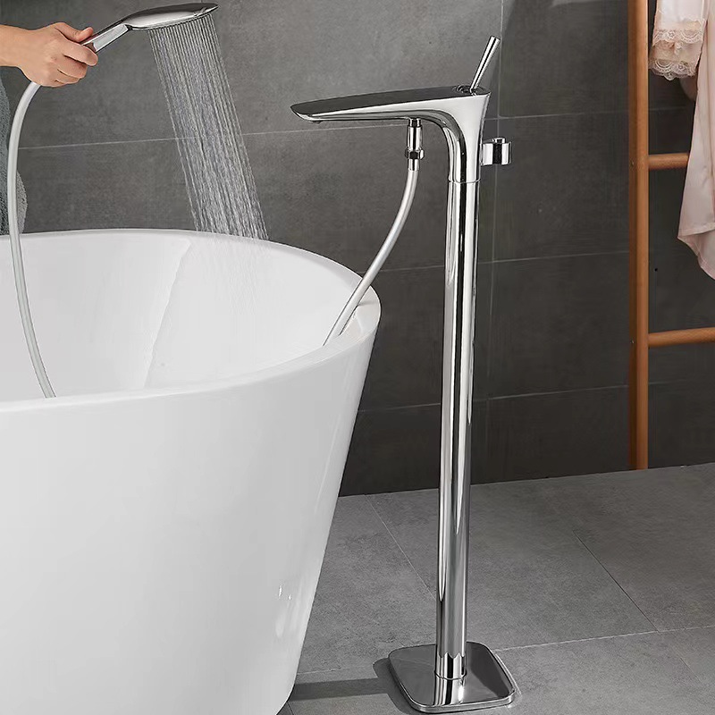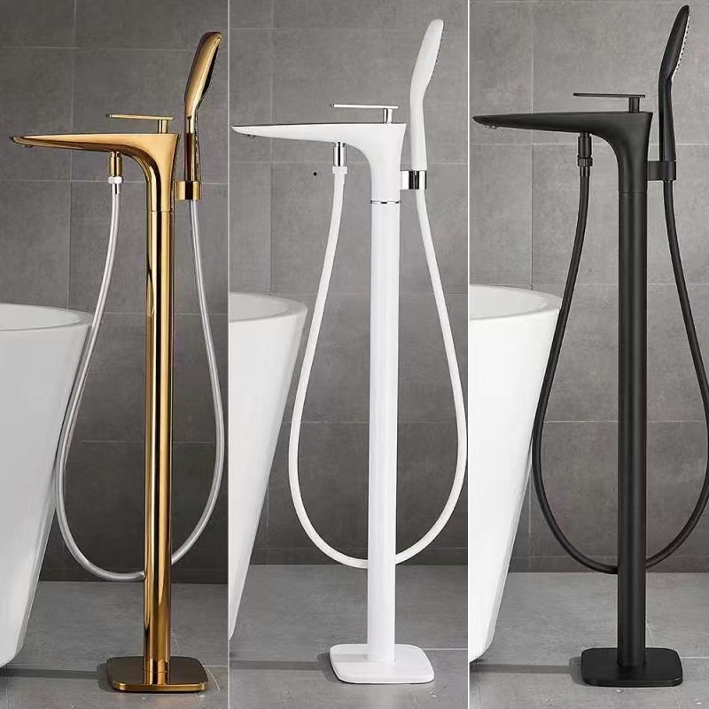 Premium floor-mounted bathtub faucet crafted from high-purity solid brass. This luxury freestanding mixer features independent hot and cold water control and a multi-functional handheld shower attachment. Ideal for five-star hotel projects and high-end modern residential bathrooms.