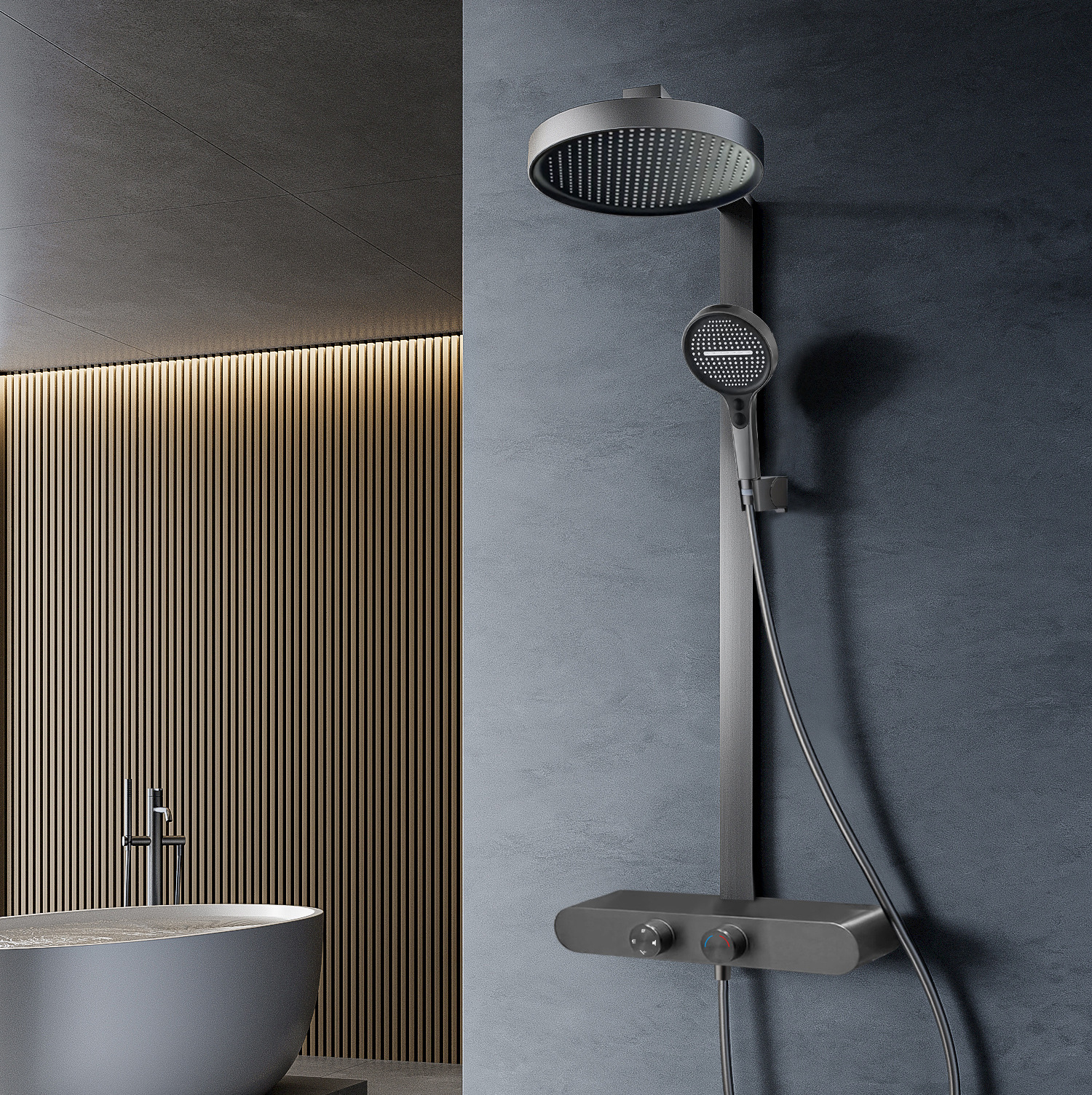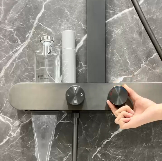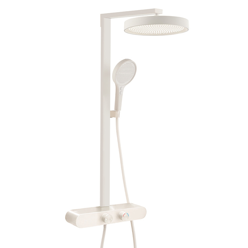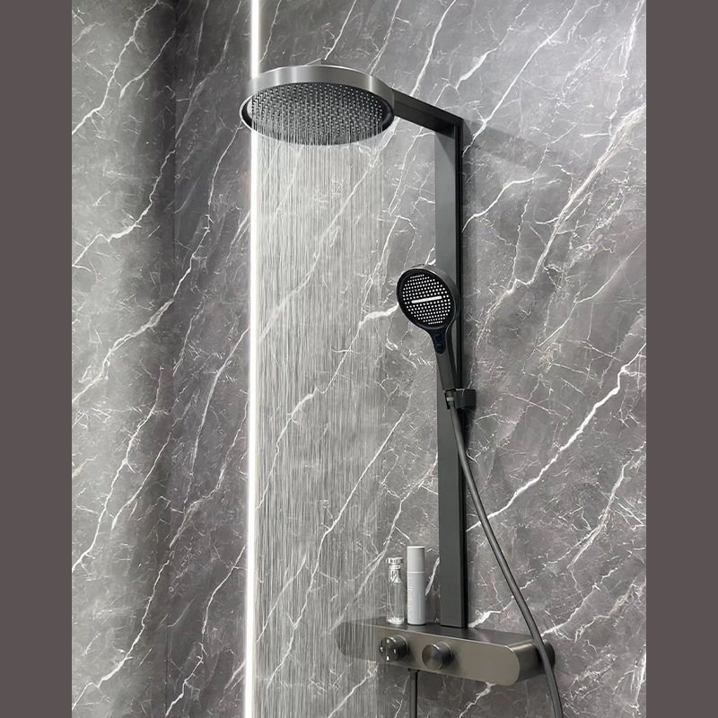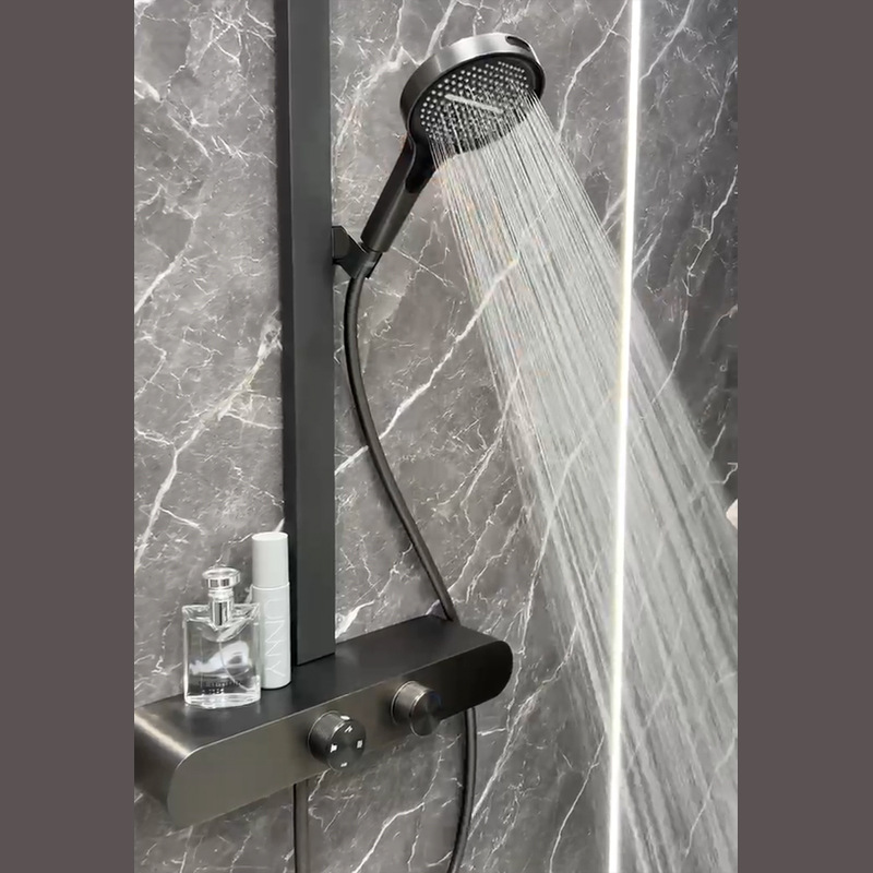 All-brass heavy-duty body with an integrated 400mm storage shelf; ultra-thin giant rainfall top spray; 3-way water distribution system; available in Gunmetal Grey and Creamy White.