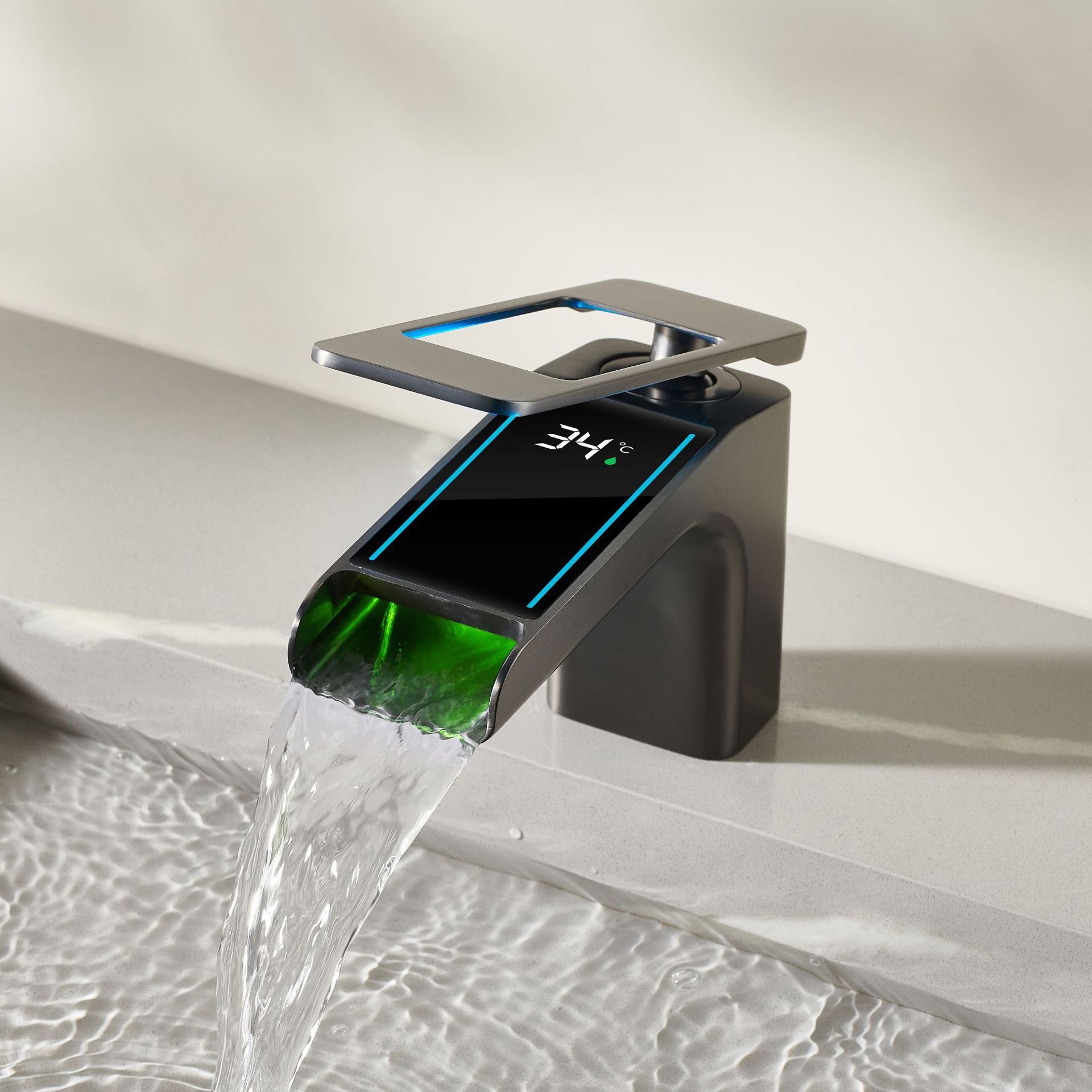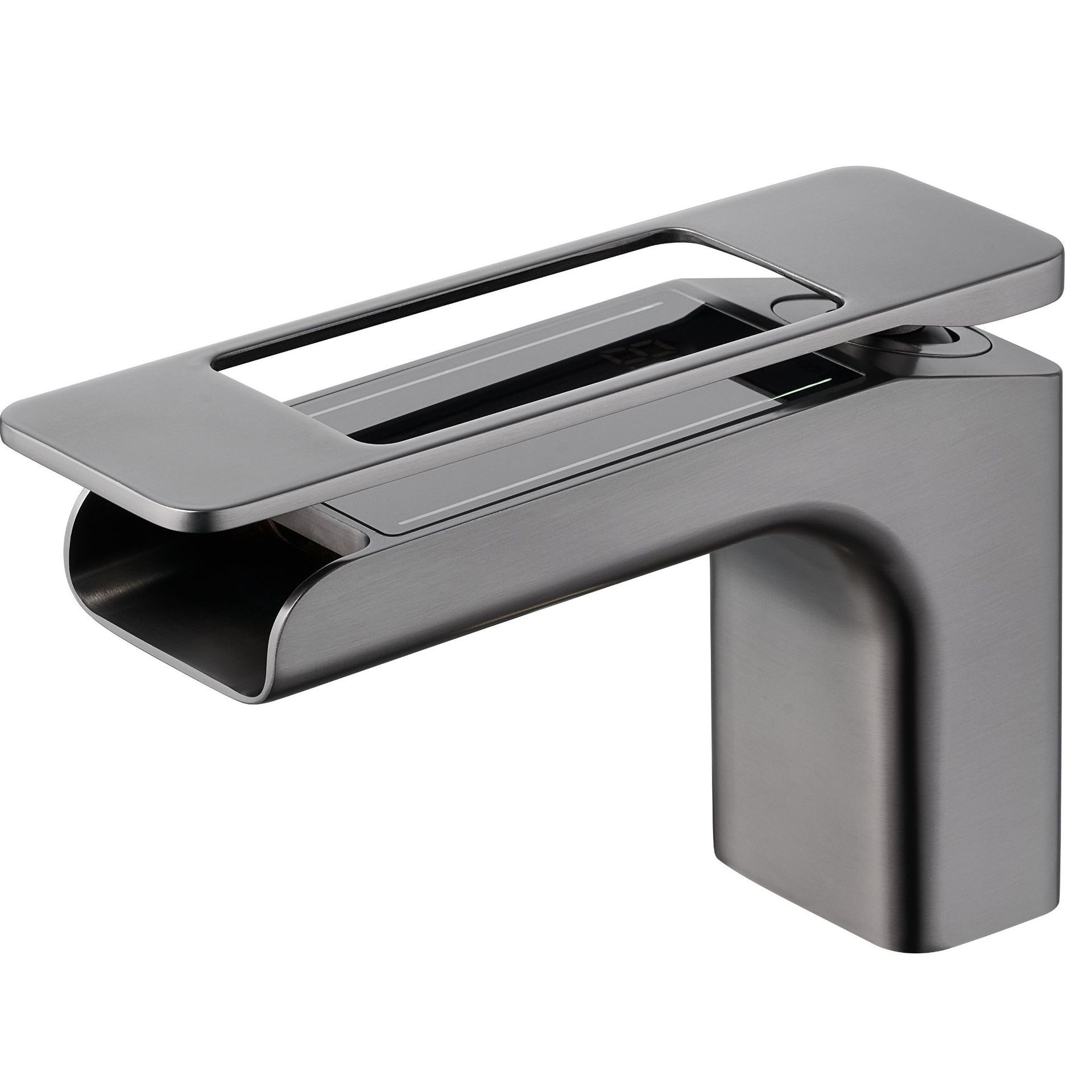 An intelligent luxury bathroom faucet made of full copper with a built-in digital display for water temperature monitoring. Designed for modern high-end basins.