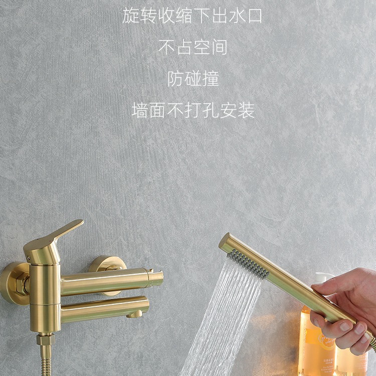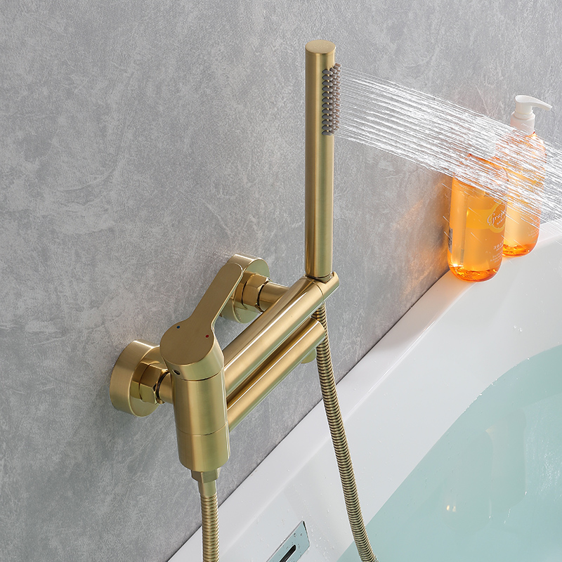High-end gold-finished bathtub faucet and shower set. Features a solid brass mixer valve for reliable temperature control and a stylish handheld shower. Designed for luxury residential bathing spaces with a focus on durability and classic aesthetics.