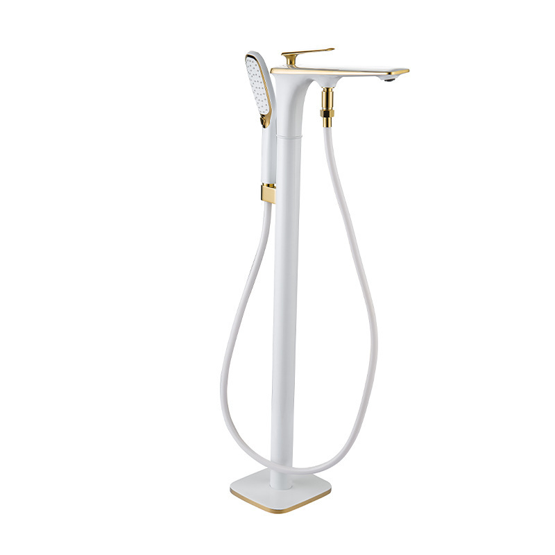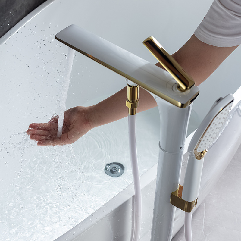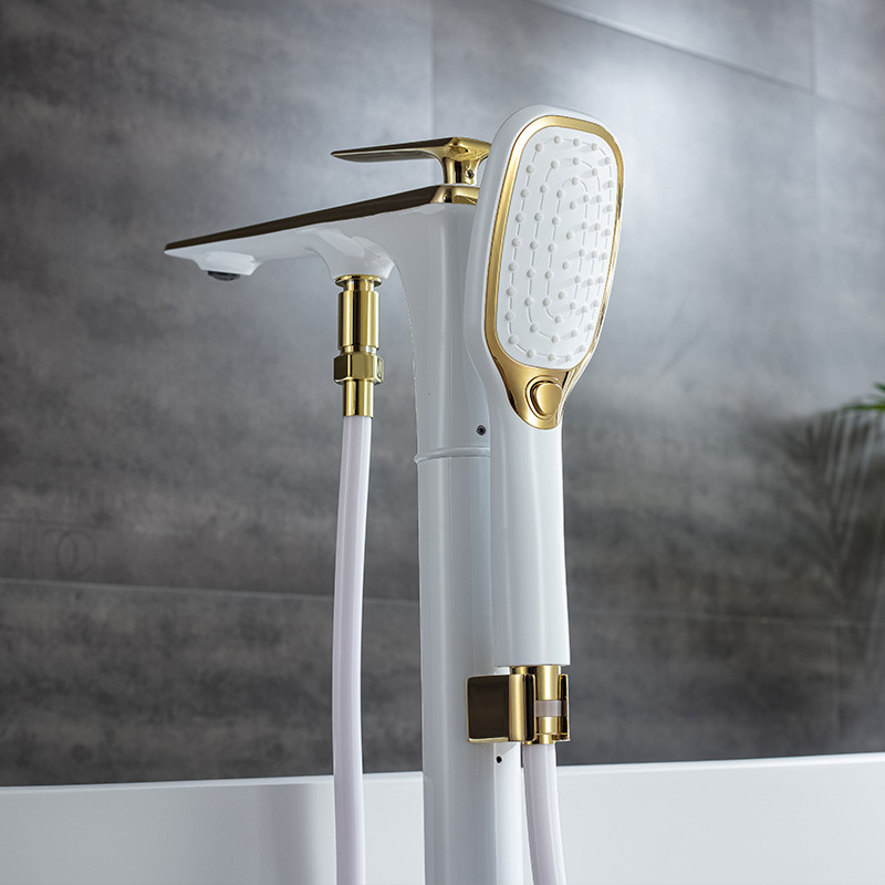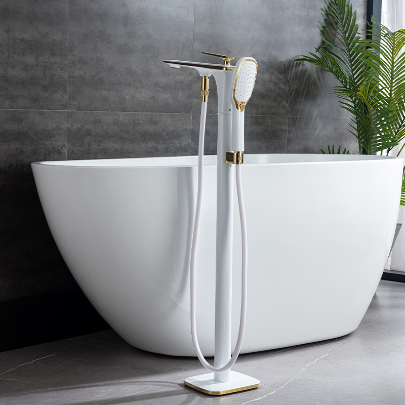 This high-end floor-standing bathtub faucet features a solid brass construction with a concealed pre-installation system. It provides precise hot and cold water control and includes a matched handheld shower head, making it ideal for luxury residential and hospitality bathroom projects.