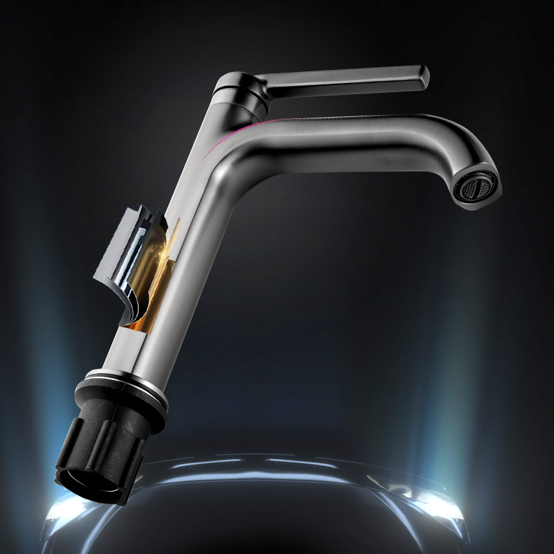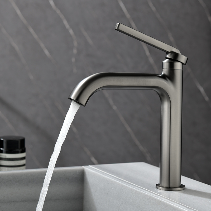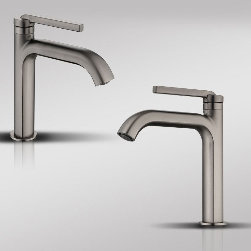Sophisticated gunmetal grey basin faucet with a tall high-arc body. Crafted from solid 59-brass with a premium ceramic valve core. Designed for modern vanity cabinets and above-counter basins. Corrosion-resistant and fingerprint-free finish.